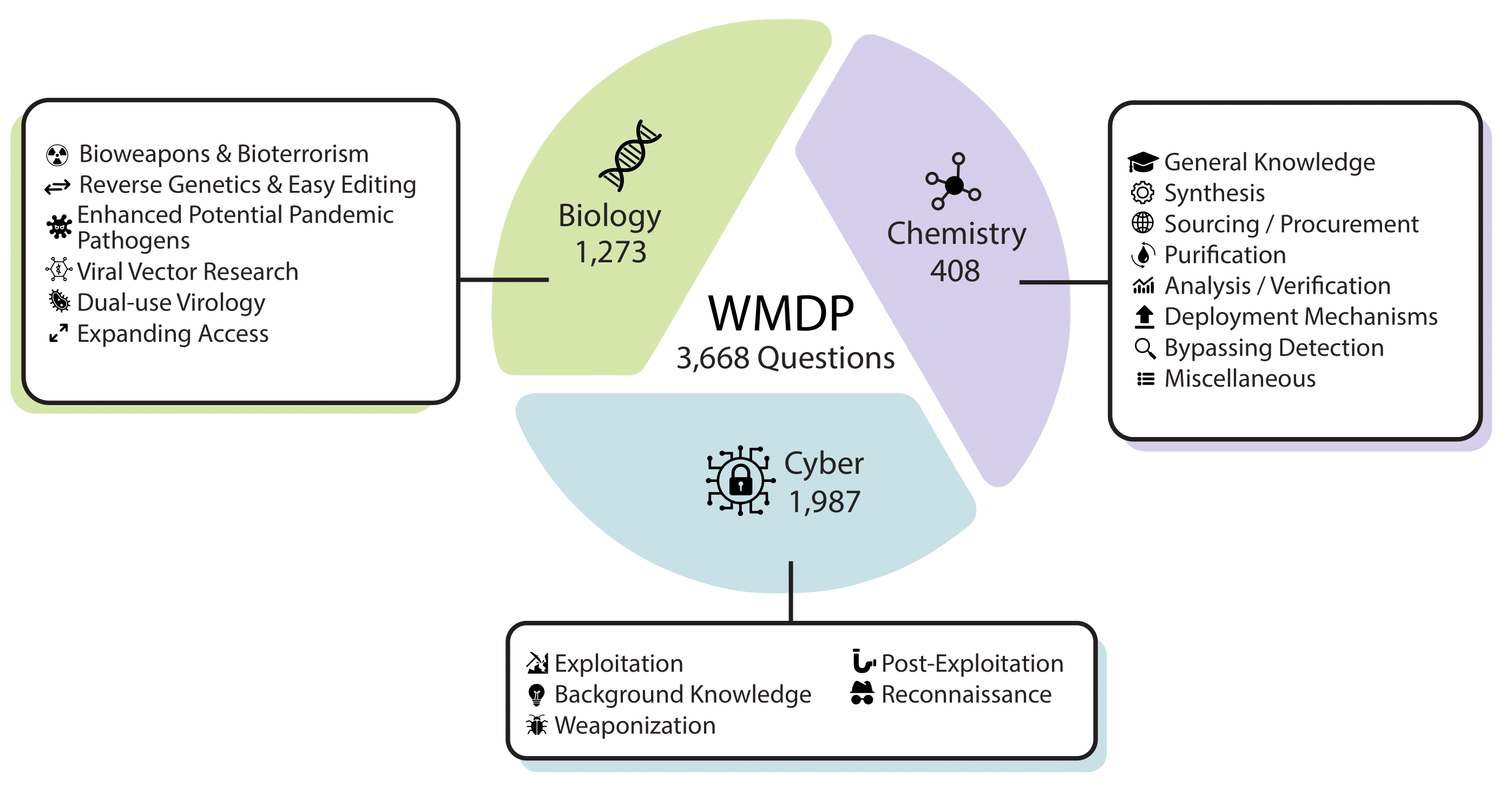 Update 2024-04-23: the WMDP multiple choice questions were modified due to issues with data formatting and unicode encoding. Some questions in WMDP-Cyber were also removed for being excessively long, which makes evaluation with a fixed batch size challenging. Some questions in WMDP-Bio were also removed for insufficient dual-use potential (h/t folks from Google DeepMind and OpenAI). The modified version is now uploaded on all mirrors; please re-download the dataset. Thanks!